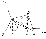 (2)过D作DF⊥OB于F,A作AG⊥DF于G,设A点的横坐标为m,则C点的横坐标为m+4,得到OE=m,EF=AG=4,根据全等三角形的性质得到DF=AG=4,根据A,C在反比例函数y=$\frac{k}{x}$的图象上,列方程即可得到结论.