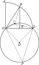(∠HOP+∠OPH)=135°,并且易证△OPI≌△ODI,得到∠DIO=∠PIO=135°,所以点I在以OD为弦,并且所对的圆周角为135°的一段劣弧上;过D、I、O三点作⊙O′,如图,连O′D,O′O,在优弧AO取点P′,连P′D,P′O,可得∠DP′O=180°-135°=45°,得∠DO′O=90°,O′O=3