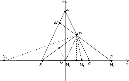 (3)由等边三角形的性质得到BO=CO=2,BD=AO=2$\sqrt{3}$,①当BD=BN=2$\sqrt{3}$时,求得N1(-2-2$\sqrt{3}$,0),N2(2$\sqrt{3}$-2,0),②当BD=DN=2$\sqrt{3}$,解直角三角形求得N3(4.0),③当BN=DN时,解直角三角形得到N4(0,0),于是得到结论.