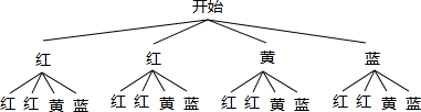 解答 解:小华说得不正确.首先把红色分成相等的两部分,画树状图得:∵共有16种等可能的结果,能配成紫色的有4种情况,∴能配成紫色的概率为:$\frac{4}{16}$=$\frac{1}{4}$,∴华说得不正确.