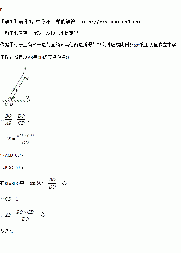 如图,一根电线杆的接线柱部分AB在阳光下的投影CD的长为1米,太阳光线与地面的夹角∠ACD=60°,则AB的长为( )