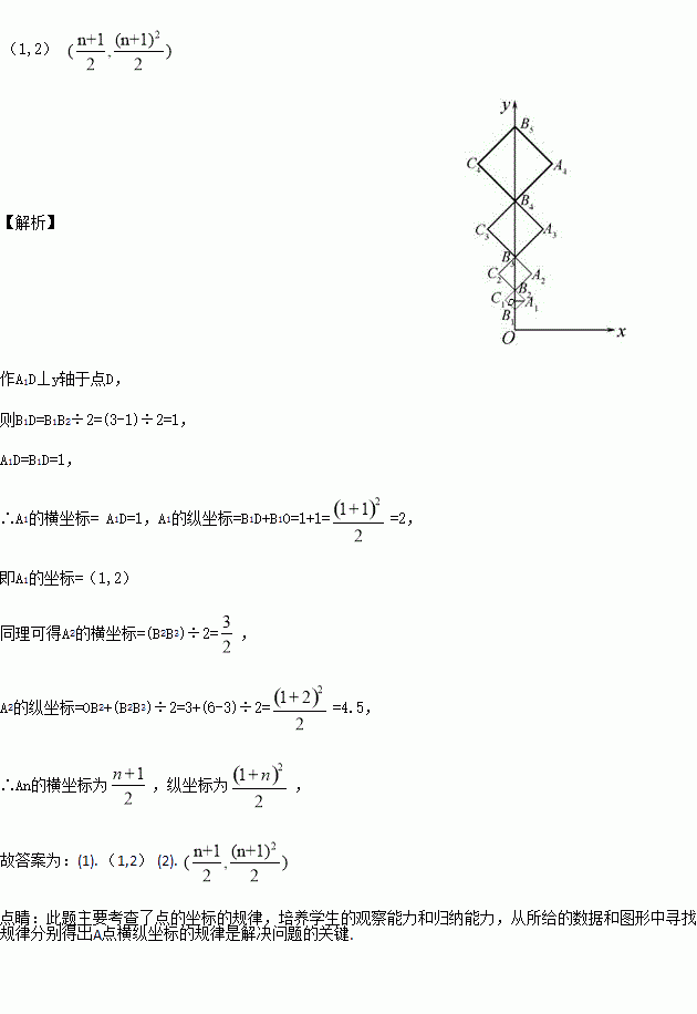 如图,在平面直角坐标系xOy中,B1(0,1),B2(0,3),B3(0,6),B4(0,10),…,以B1B2为对角线作第一个正方形A1B1C1B2,以B2B3为对角线作第二个正方形A2B2C2B3,以B3B4为对角线作第三个正方形A3B3C3B4,…,如果所作正方形的对角线BnBn+1都在y轴上,且BnBn+1的长度依次增加1个单位,顶点An都在第一象限内(n≥1,且n为整数). 那么A1的坐标为____________;An的坐标为_________(用含n的代数式表示).