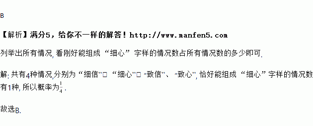 有 A、B 两只不透明口袋,每只口袋里装有两只相同的球,A 袋中的两只球上分别写了“细”“致” 的字样,B 袋中的两只球上分别写了“信”“心”的字样,从每只口袋里各摸出一只球,刚好能组成“细 心”字样的概率是( )