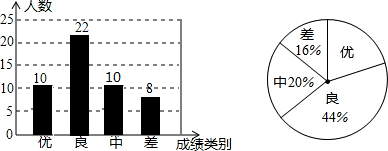 则成绩类别为“中”的学生数为:50×20%=10(人),补全条形统计图如图:![]()