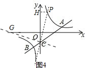£¨3£©¢ÙÈôÖ±ÏßABÈÆµãCÄæÊ±ÕëÐýת45¡ãºó£¬ÓëË«ÇúÏßÏཻÓÚµãP£¬Èçͼ3£®¹ýµãC×÷CD¡ÎxÖᣬ¹ýµãP×÷PE¡ÍCDÓÚE£¬¹ýµãA×÷AF¡ÍCDÓÚF£¬¿ÉÏÈÇó³öµãA¡¢B¡¢CµÄ×ø±ê£¬´Ó¶øÇó³ötan¡ÏACFµÄÖµ£¬½ø¶øÀûÓúͣ¨²î£©½ÇÕýÇй«Ê½Çó³ötan¡ÏPCE=tan£¨45¡ã+¡ÏACF£©µÄÖµ£¬ÉèµãPµÄ×ø±êΪ£¨a£¬b£©£¬¸ù¾ÝµãPÔÚ·´±ÈÀýº¯ÊýµÄͼÏóÉϼ°tan¡ÏPCEµÄÖµ£¬¿ÉµÃµ½¹ØÓÚa¡¢bµÄÁ½¸ö·½³Ì£¬½âÕâ¸ö·½³Ì×é¾Í¿ÉµÃµ½µãPµÄ×ø±ê£»¢ÚÈôÖ±ÏßABÈÆµãC˳ʱÕëÐýת45¡ãºó£¬ÓëxÖáÏཻÓÚµãG£¬Èçͼ4£¬ÓÉ¢Ù¿ÉÖª¡ÏACP=45¡ã£¬P£¨£¨$\frac{4}{3}$£¬3£©£¬ÔòÓÐCP¡ÍCG£®¹ýµãP×÷PH¡ÍyÖáÓÚH£¬Ò×Ö¤¡÷GOC¡×¡÷CHP£¬¸ù¾ÝÏàËÆÈý½ÇÐεÄÐÔÖÊ¿ÉÇó³öGO£¬´Ó¶øµÃµ½µãGµÄ×ø±ê£¬È»ºóÓôý¶¨ÏµÊý·¨Çó³öÖ±ÏßCGµÄ½âÎöʽ£¬È»ºó½«Ö±ÏßCGÓë·´±ÈÀýº¯ÊýµÄ½âÎöʽ×é³É·½³Ì×飬ÏûÈ¥y£¬µÃµ½¹ØÓÚxµÄ·½³Ì£¬ÔËÓøùµÄÅбðʽÅж¨£¬µÃµ½·½³ÌÎÞʵÊý¸ù£¬´ËʱµãP²»´æÔÚ£®