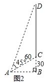 £¨2£©Èçͼ2£¬ÔÚRt¡÷ABCÖУ¬ÔËÓù´¹É¶¨ÀíÇó³öAB£¬ÔËÓÃÈý½Çº¯ÊýÇóµÃ¡ÏBAC=30¡ã£®´Ó¶øµÃµ½¡ÏDAB=75¡ã£®ÔÚRt¡÷ABDÖУ¬ÔËÓÃÈý½Çº¯Êý¾Í¿ÉÇó³öDB£¬´Ó¶øÇó³öDC³¤£»