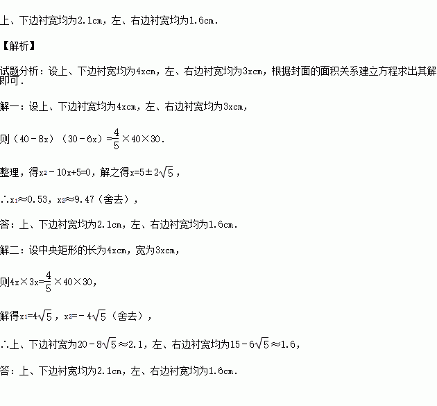 (2015秋•江宁区期末)如图,要设计一本画册的封面,封面长40cm,宽30cm,正中央是一个与整个封面长宽比例相同的矩形画.如果要使四周的边衬所占面积是封面面积的