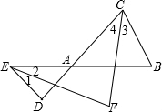分析 由CF、EF分别平分∠ACB和∠AED,得∠3=∠4,∠1=∠2,所以有∠3+∠B=∠2+∠F;∠3+∠4+∠B=∠1+∠2+∠D,即2∠3+∠B=2∠2+∠D,而∠B=70°,∠D=40°,于是由两个等式即可求出∠F.