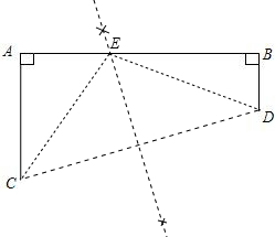 如图,铁路上A,B两站(视为同一直线上的两点)相距25km,C、D为两村庄(视为两个点),DA⊥AB于A,CB⊥AB于B,已知DA=15km,CB=10km,现在要在铁路AB上建一个土特产品收购站E,使C,D两村到E站的距离相等且垂直,则E站应建在距A站多少千米处? ![]()