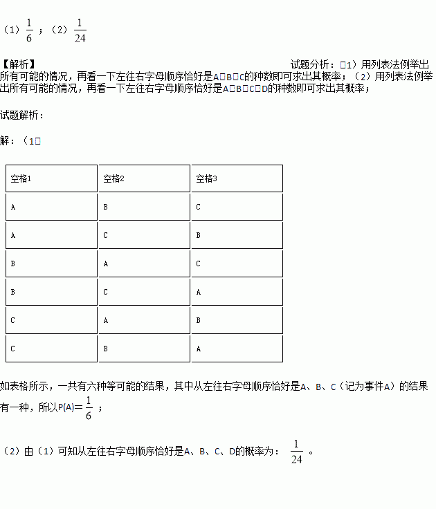 (2)若在如图三个空格的右侧增加一个空格,将A、B、C、D四个字母任意填写其中(每空填一个字母,每空中的字母不重复),从左往右字母顺序恰好是A、B、C、D的概率为 .