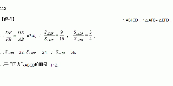 如图在□ABCD中,点E在边DC上,DE:EC=3:1,连接AE交BD于点F,若△DEF的面积为18,则□ABCD的面积为___________.