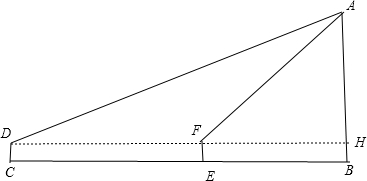 分析 先画出几何图形,如图,CD=EF=BH=1.6m,CE=DF=36m,∠ADH=30°,∠AFH=30°,分别利用正切定义得到FH=$\frac{AH}{tan60°}$,DH=$\frac{AH}{tan30°}$,则$\frac{AH}{tan30°}$-$\frac{AH}{tan60°}$=36,再利用特殊角的函数值可计算出AH=18$\sqrt{3}$,然后计算AH+BH即可.
