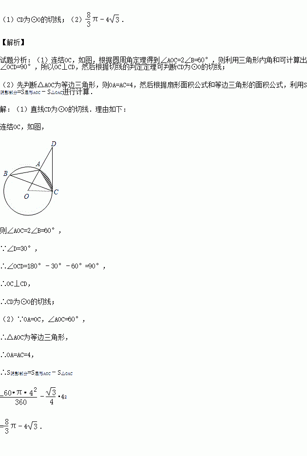 (2015秋•达拉特旗校级期末)如图,已知△ABC是⊙O的内接三角形,D是OA延长线上的一点,连接DC,且∠B=∠D=30°,AC=4.