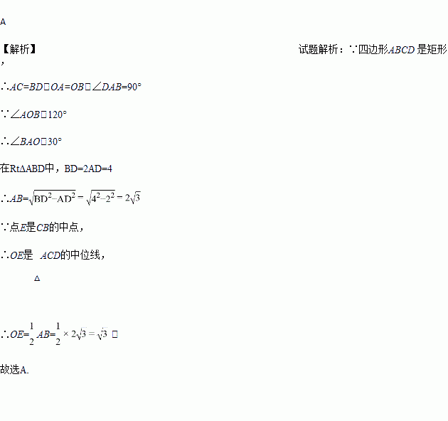 如图,矩形ABCD的两条对角线相交于点O,∠AOB=120°,AD=2,点E是BC的中点,连结OE,则OE的长是( )