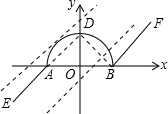 分析 (1)利用直径所对的圆周角是直角,从而判定三角形ADB为等腰直角三角形,其直角边的长等于两直线间的距离;