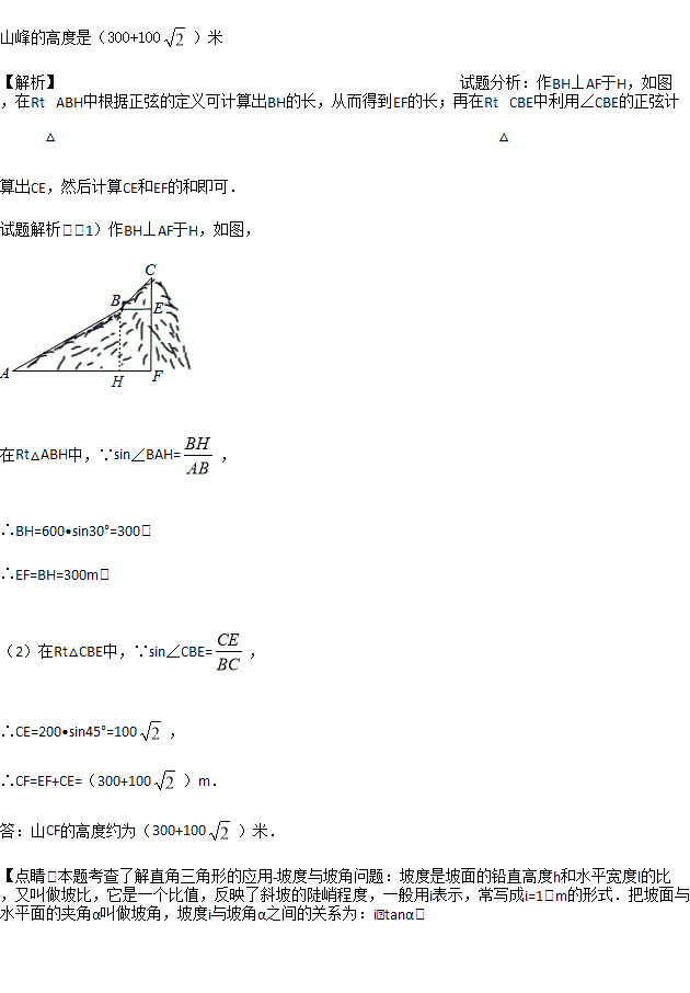如图,为测量一座山峰CF的高度,将此山的某侧山坡划分为AB和BC两段,每一段山坡近似是“直”的.其中测得坡长AB=600米,BC=200米,坡角∠BAF=30°,∠CBE=45°.求山峰的高度CF(结果保留根号)