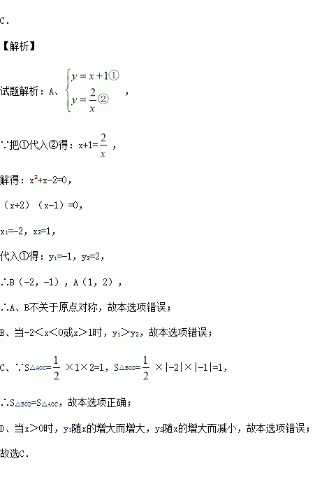 C.S△AOC=S△BOD D.当x>0时,y1、y2都随x的增大而增大