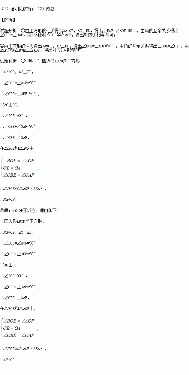 ①如图1,若E是AC上的点,过A 作AG⊥BE于G,AG、BD交于F,求证:OE=OF