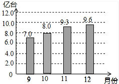 (2)2014年9-12这三个月“移动电商行业用户规模”比上个月增长的平均数为=$\frac{1+1.3+0.3}{3}$≈0.9亿台