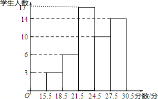 (2)先计算出成绩在21.5~24.5这一组的频数,然后补全统计图;