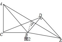 (2)连接BF,根据全等三角形的性质得到AB=BE,CB=BD,∠CBA=∠DBE,根据角的和差得到∠CBD=∠ABE,由等腰三角形的性质得到∠CDB=$\frac{180°-∠CBD}{2}$,∠BEA=$\frac{180°-∠ABE}{2}$,推出B,E,D,F四点共圆,根据圆周角定理得到∠BFE=∠BDE=90°,然后根据等腰三角形的性质即可得到结论.