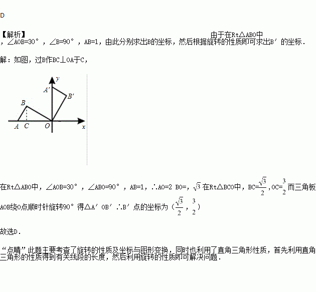如图,将放置于直角坐标系中的三角板AOB绕O点顺时针旋转90°得△A1OB1.已知∠AOB=30°,∠B=90°,AB=1,则B1点的坐标为( )