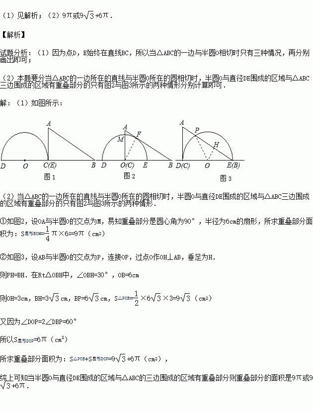 (2)当△ABC的一边与半圆O相切时,如果半圆O与直径DE围成的区域与△ABC的三边围成的区域有重叠部分,求重叠部分的面积.