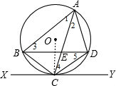 分析 (1)连结OC,如图,先根据切线的性质得OC⊥XY,由于BD∥XY,则OC⊥BD,则利用垂径定理可得$\widehat{BC}$=$\widehat{CD}$,接着根据圆周角定理得∠1=∠2,且∠3=∠4,于是可根据“ASA”判断△ABE≌△ACD;
