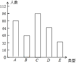 分析 (1)由E类型的人数及其百分比求得总人数,总人数乘以A类型百分比可得其人数,在用总人数减去其余各组人数得出D类型人数,即可补全条形图;