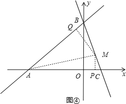 当M在线段BC上时,过M分别作MP⊥x轴,MQ⊥AB,垂足分别为P、Q,如图④,![]()