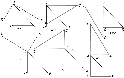 一副三角尺按如图所示叠放在一起,若固定△AOB,改变△ACD的位置(其中点A位置始终不变),使△ACD得一边与△AOB的某一边平行.请画出相应的草图,并直接写出∠BAD的度数.