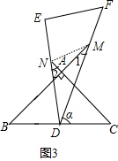 ③由∠1≥$\frac{2}{3}$∠2,∠1+∠2=60°可解得∠1≥24°,由于∠C+∠MDC=∠1+∠MAC,即45°+α=∠1+90°,则∠1=α-45°,所以α-45°≥24°,解得α≥69°,利用直角三角板DEF的边DF、DE分别交BA、CA的延长线于点M、N得到α<90°,于是得到69°≤α<90°.