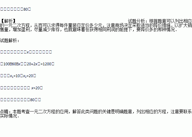 银隆百货大楼服装柜在销售中发现:“COCOTREE”牌童装每件成本60元,现以每件100元销售,平均每天可售出20件.为了迎接“五•一”劳动节,商场决定采取适当的降价措施,以扩大销售量,增加盈利,尽量尽快减少库存.经市场调查发现:如果每件童装降价1元,那么平均每天就可多销售2件.要想平均每天销售这种童装盈利1200元,请你帮商场算一算,每件童装应定价多少元?