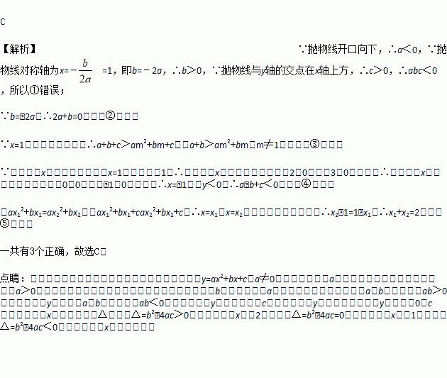 如图:二次函数y=ax2+bx+c的图象所示,下列结论中:①abc>0;②2a+b=0;③当m≠1时,a+b>am2+bm;④a-b+c>0;⑤若ax12+bx1=ax22+bx2,且x1≠x2,则x1+x2=2,正确的个数为