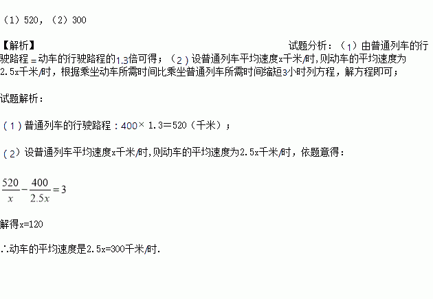 从泰州到某市,可乘坐普通列车或动车,已知动车的行驶路程是400千米,普通列车的行驶路程是动车的行驶路程的1.3倍.