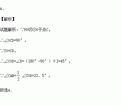 如图,AB是⊙O的直径,PD切⊙O于点C,交AB的延长线于D,且CO=CD,则∠CAB的度数是( )