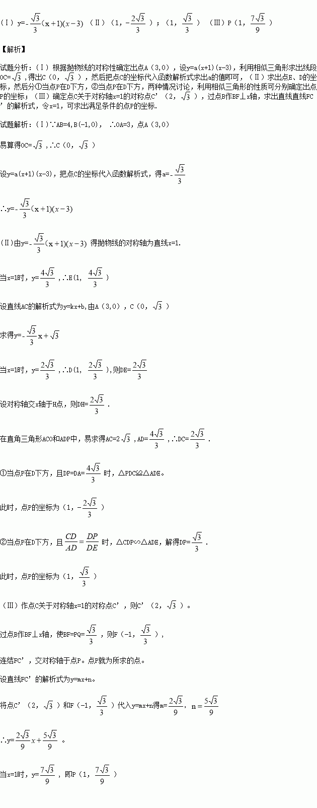 (Ⅱ)设对称轴与抛物线交于点E,与AC交于点D。在对称轴上,是否存在点P,使以点P、C、D为顶点的三角形与ΔADE相似?若存在,请求出点P的坐标;若不存在,请说明理由。