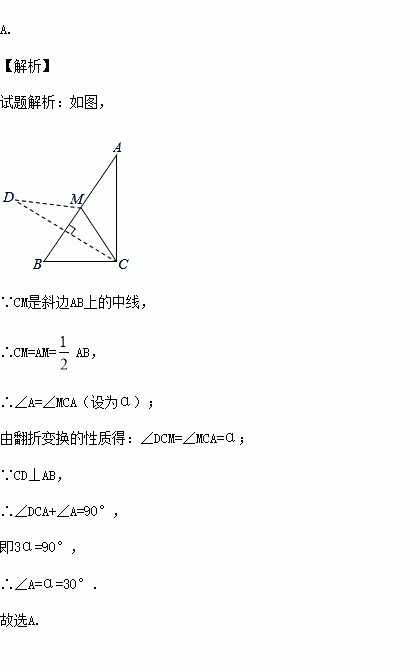已知:如图,在Rt△ABC中,∠ACB=90°,∠A<∠B,CM是斜边AB上的中线,将△ACM沿直线CM折叠,点A落在点D处,如果CD恰好与AB垂直,那么∠A的度数是( )