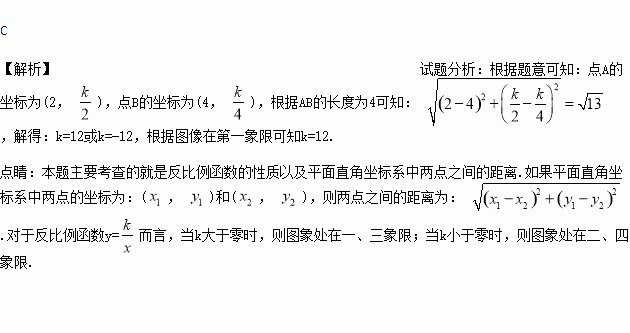 (x>0)的图象上有A、B两点, A点的横坐标为2,B点的横坐标为4,且AB=