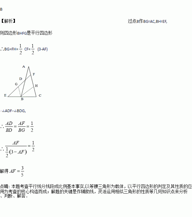 如图,ΔABC是等腰三角形,AB=AC=3,BC=1. 点D在AB边上,点E在CB的延长线上,已知AD=1,BE=1,连接ED并延长交AC于点F, 则线段AF的长为( )