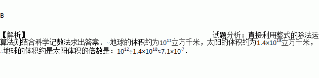 地球的体积约为1012立方千米,太阳的体积约为1.4×1018立方千米,地球的体积约是太阳体积的倍数是( )