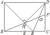 分析 先证明△ABE和△ADH等腰直角三角形,得出AD=AE,AB=AH=DH=DC,得出∠ADE=∠AED,即可得出①正确;先证出OE=OH,同理:OD=OH,得出OE=OD,②正确;由ASA证出△BEH≌△HDF,得出③正确;过H作HK⊥BC于K,可知KC=$\frac{1}{2}$BC,HK=KE,得出$\frac{1}{2}$BC=HK+HE,BC=2HK+2HE=FC+2HE,得出④正确;由AB=AH,∠BAE=45°,得出△ABH不是等边三角形,AB≠BH,即AB≠HF,故⑤错误.