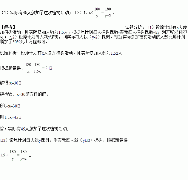 为了城市绿化建设,某中学初三(2)班计划组织部分同学义务植树180棵,由于同学们参与的积极性很高,实际参加植树活动的人数比原计划增加了