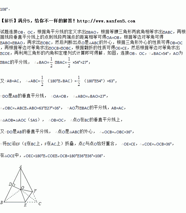 如图,在△ABC中,AB=AC,∠BAC=54°,∠BAC的平分线与AB的垂直平分线交于点O,将∠C沿EF(点E在BC上,点F在AC上)折叠,点C与点O恰好重合,则∠OEC的度数为________.