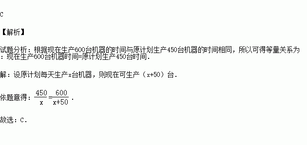 (2012•吉林)某工厂现在平均每天比原计划多生产50台机器,现在生产600台机器所需的时间与原计划生产450台机器所需时间相同.设原计划每天生产x台机器,则可列方程为( )