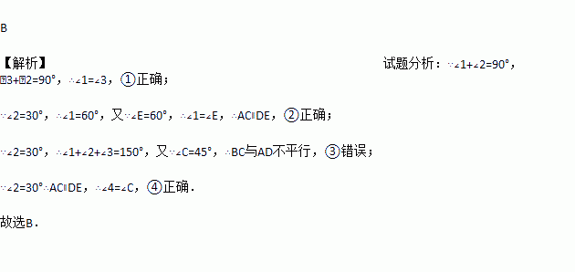 ①1=∠3;②如果∠2=30°则有AC∥DE;③如果∠2=30°,则有BC∥AD;④如果∠2=30°,必有∠4=∠C,