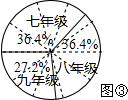 (2)从2中得出七、八年级的总人数都为800人,九年级为600人,根据扇形所对圆心角的度数与百分比的关系是:圆心角的度数=百分比×360度计算相对应的圆心角.据此画出扇形统计图.
