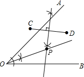 如图,已知∠AOB及点C、D两点,请利用直尺和圆规作一点P,使得点P到射线OA、OB的距离相等,且P点到点C、D的距离也相等.