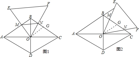如图1,已知点O为菱形ABCD的对角线的交点,∠A=60°,将等边△OEF的顶点放在O处,直线OE、OF分别交直线AB、BC于M、N.