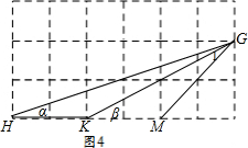 (2)根据已知,把△GHK放到正方形网格中,连结GM,如图4,由图得知各个相等的长度,于是得到$\frac{HG}{GK}=\frac{HM}{MG}=\frac{GM}{KM}$=$\sqrt{2}$,得到△MKG∽△MGH,求得∠α=∠1,根据三角形外角的性质即可得到结果.